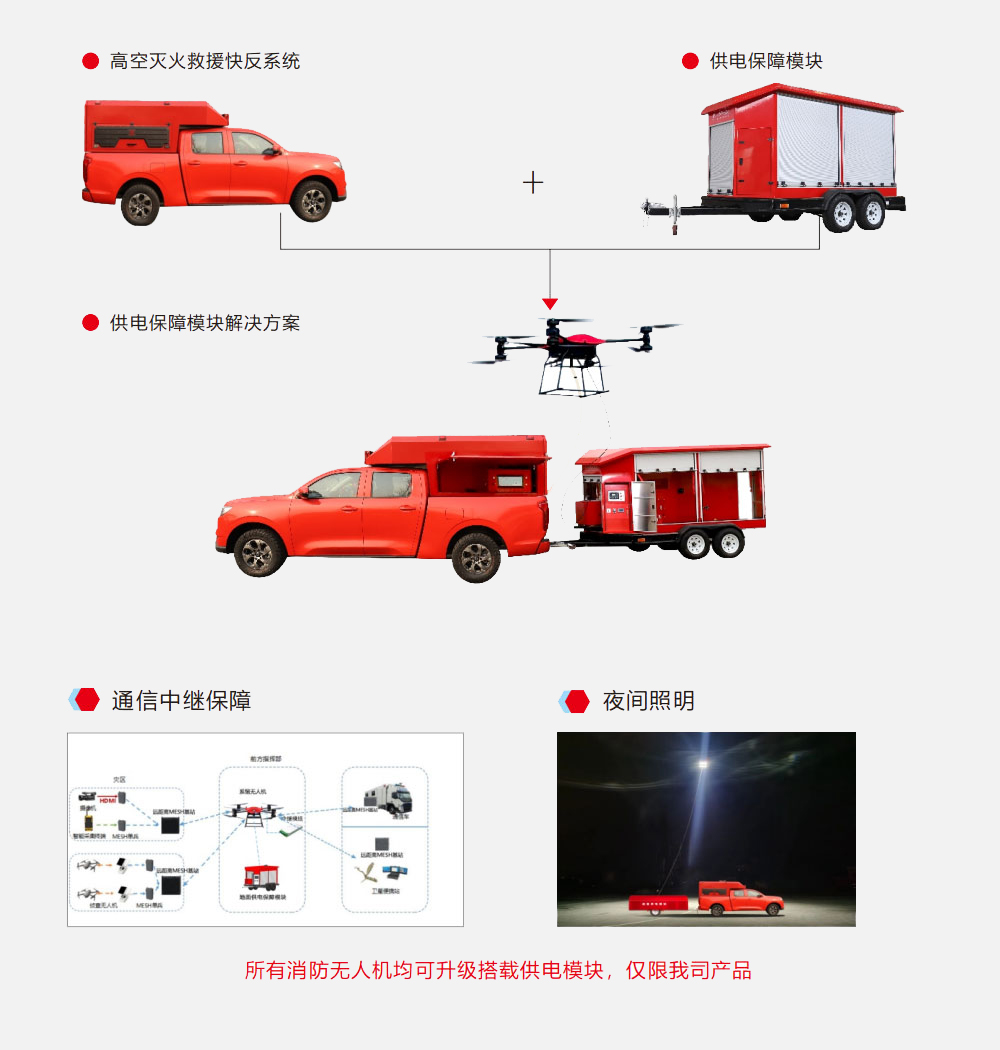 供电保障模块作为独立的拖挂单元系统,可配套我司的高空灭火救援快反系统或多种型号的消防车/皮卡车组成供电保障模块解决方案,实现应急救援中持续8小时不间供电,延长消防无人机高空作业时间;同时该方案还可以通信中继、应急照明等救援功能,为抢险救灾提供供电和通信保障。