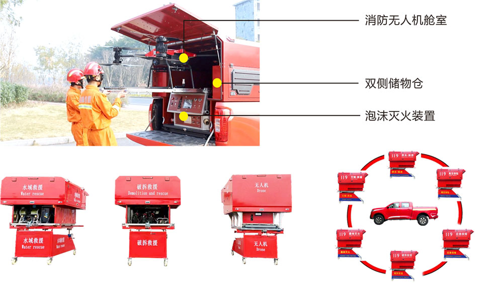 高空灭火救援快反系统采用模块化设计,以皮卡车为运输平台,搭载无人机飞行平台、泡沫灭火装置等救援装备,具备A类泡沫灭火、抢险救援、无人机运输等多种功能,可迅速将消防无人机及其配套系统转运至灾害现场开展灭火救援作业。